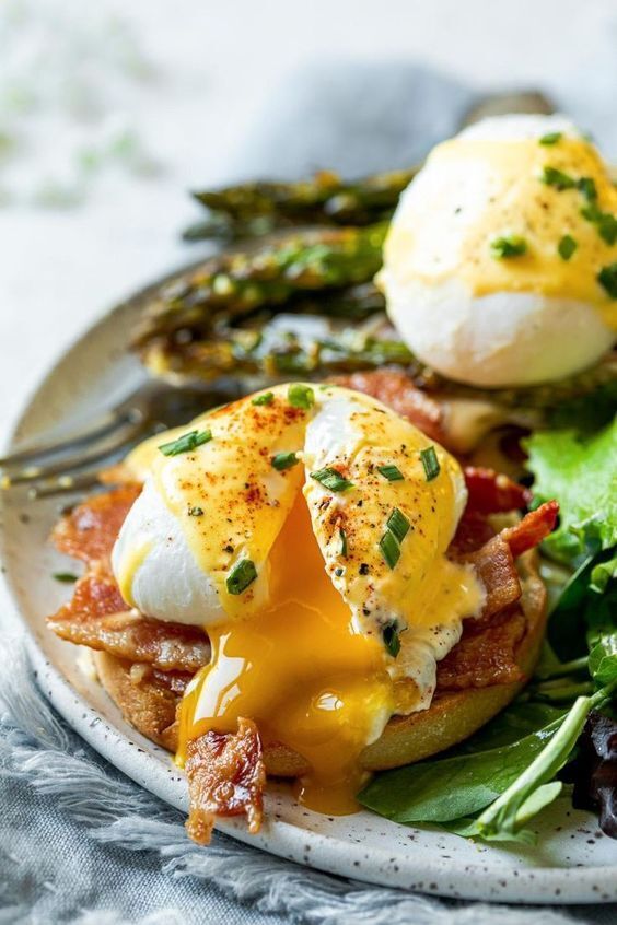 - Золотистая бриошь с нежным пашотом, хрустящим беконом и ароматным луком