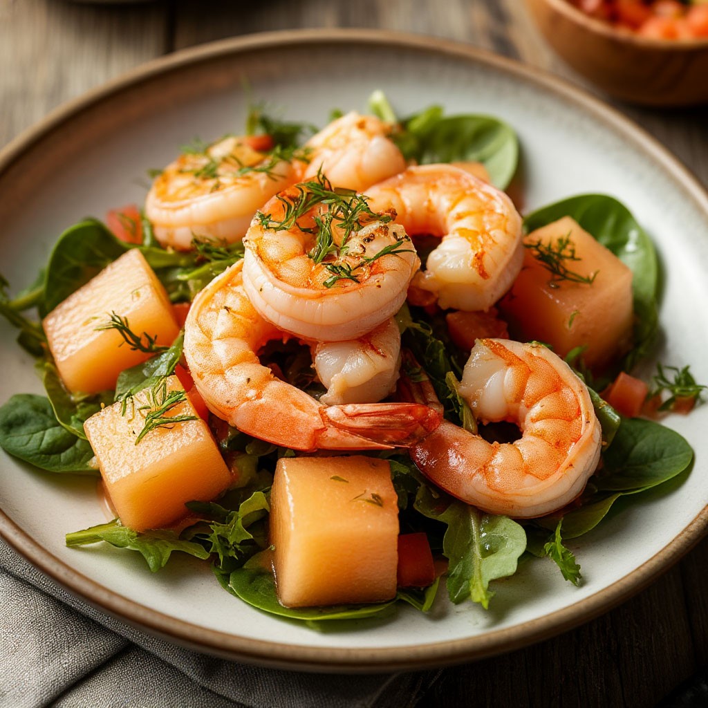 1. Легкий салат с креветками фламбе и дыней: танец огня и прохлады.