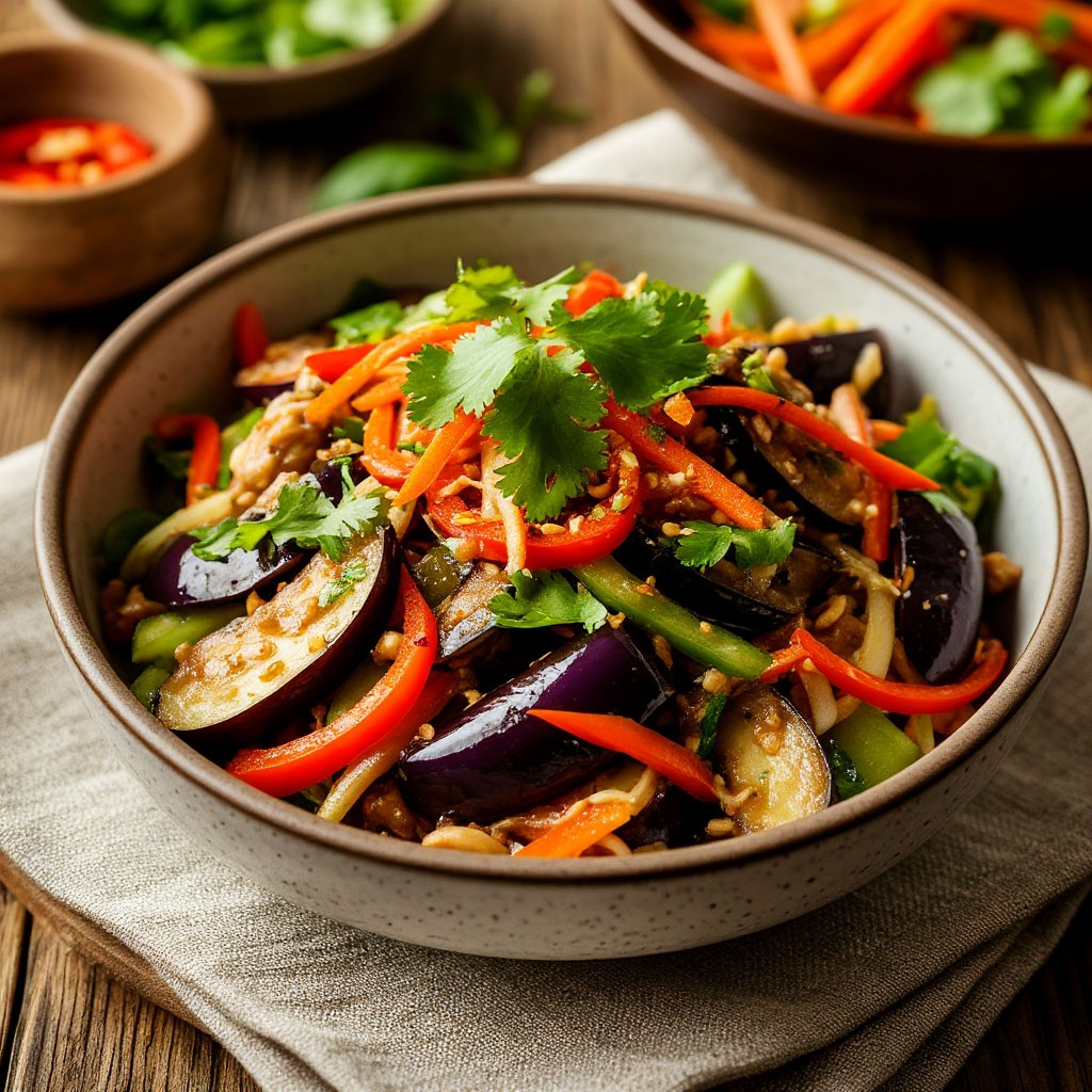 Мы возьмём привычный овощ и придадим ему экзотический характер. Вы освоите технику приготовления баклажанов, при которой они приобретают хрустящую оболочку, оставаясь бархатистыми внутри. Ключевым решением станет заправка — яркий «связующий элемент», который объединит сочность овощей, пряность зелени и остроту перца в единый архитектурный ансамбль. Это блюдо о ритме вкуса и эстетике свежих линий.