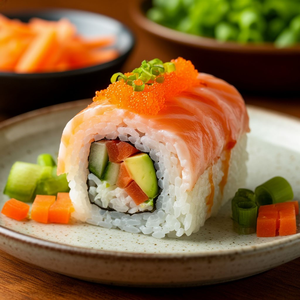 На этом этапе мы изучим технику урамаки (роллы рисом наружу). Вы научитесь работать с икрой тобико, создавая яркую и хрустящую оболочку, и поймете, как правильно распределять ингредиенты, чтобы ролл сохранял форму и сочность. Это упражнение на точность движений и умение сочетать текстуру краба, авокадо и свежего огурца в единый архитектурный ансамбль.