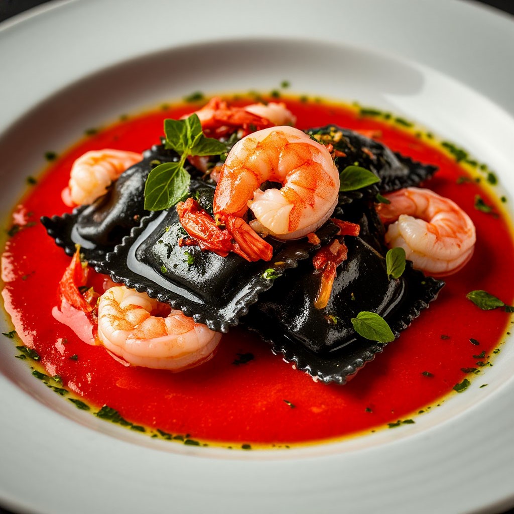 - Черные равиоли с креветками и красной рыбой: эстетика контраста.